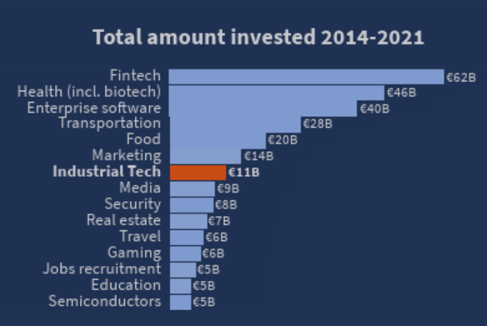 据《Dealroom:2021年工业科技报告》显示,2014-2021年,欧洲工业科技投资总额为110亿欧元,仍然是一个投资相对不足的产业类别。然而,从2014年以来的风险投资来看,尽管基础较小,但它的增长速度比许多行业都要快。