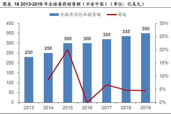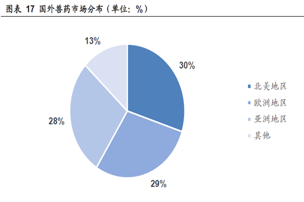 根据国际动保联盟IFAH统计,2013-2019年全球兽药销售额由230亿美元增长到350亿美元,2013-2019年CAGR为7.3%。从市场分布区域来看,北美地区是当前全球最大的兽药市场,占比为30%,排在第二的是欧洲和亚洲,占比分别为29%和28%。