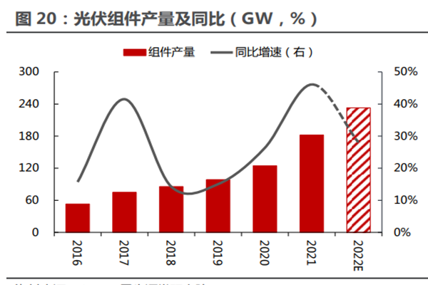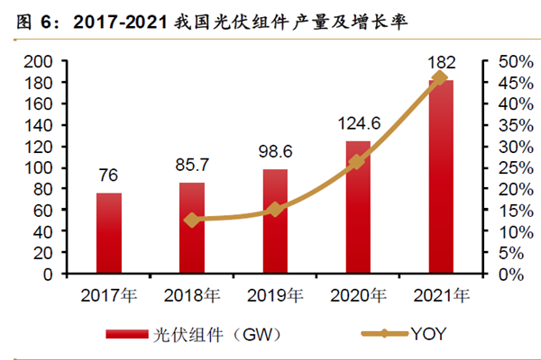 据数据显示,2017-2021年中国光伏组件产量由76GW增长至182GW,同比增长了46.1%。随着我国光伏组件产量不断扩大,排名前五企业产量占我国组件总产量的63.4%,前五名企业光伏组件产量均超过了10GW。预计到2022年中国光伏组件产量超过了233GW。