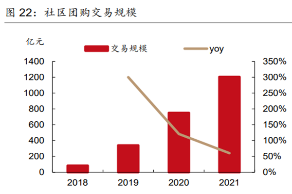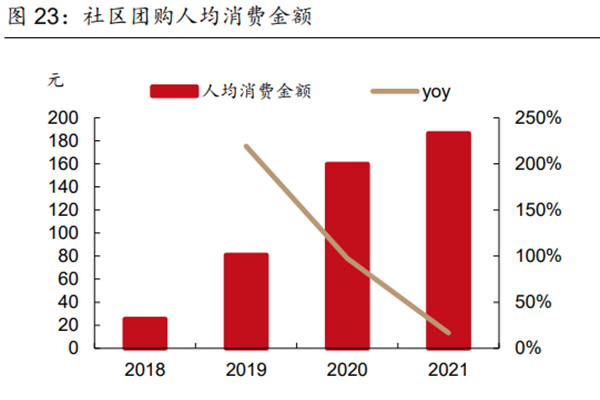 从交易规模上来看,2018-2021年中国社区团购交易规模增长至1025亿元,同比增长了60%。从社区团购人均消费金额方面来看,2021年中国社区团购人均消费达187元,同比增长了17%。