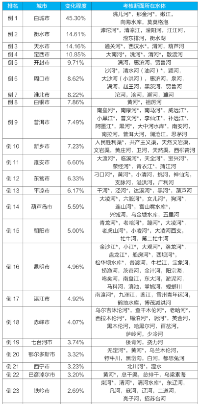 吕梁、呼和浩特和大兴安岭等30个城市国家地表水考核断面水环境质量变化情况相对较好(从第1名至第30名),白城、衡水和天水等30个城市国家地表水考核断面水环境质量变化情况相对较差(从倒数第1名至倒数第30名)。见附表3~附表4。