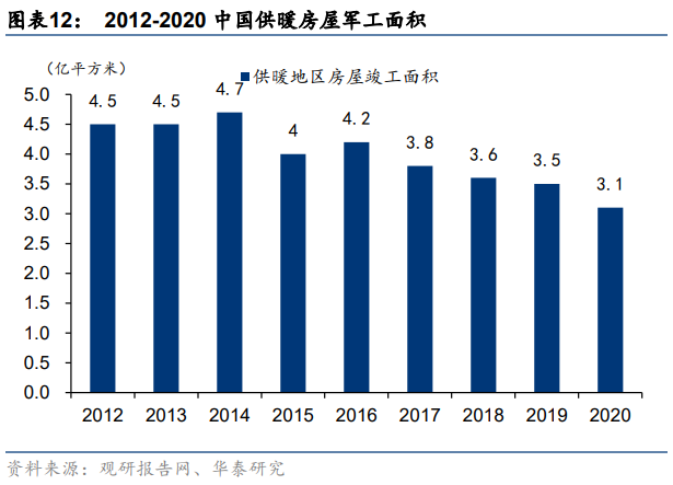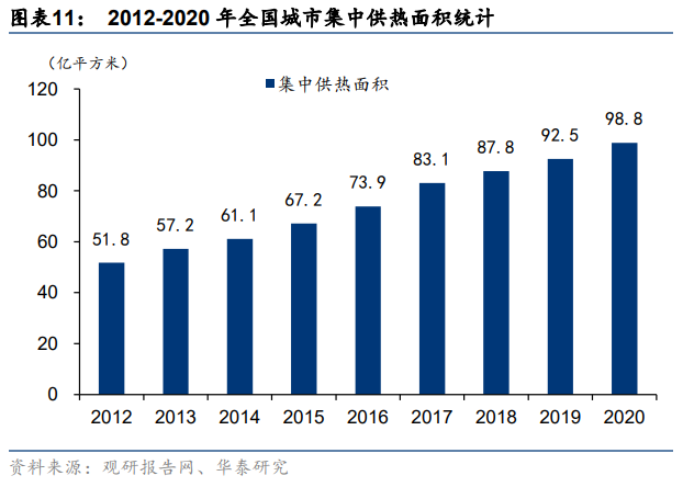 据数据显示,2020 年我国城市集中供热面积 99 亿平方米,每年供暖地区(华北、东北、西北地区和山东)新增供暖建筑面积 3~5