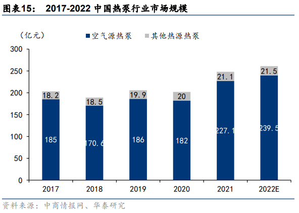 22.87%。未来根据相关建筑减碳要求的加速实施,中国热泵市场规模有望持续上升,预计 2022 年我国热泵行业市场规模达 261 亿元。2021