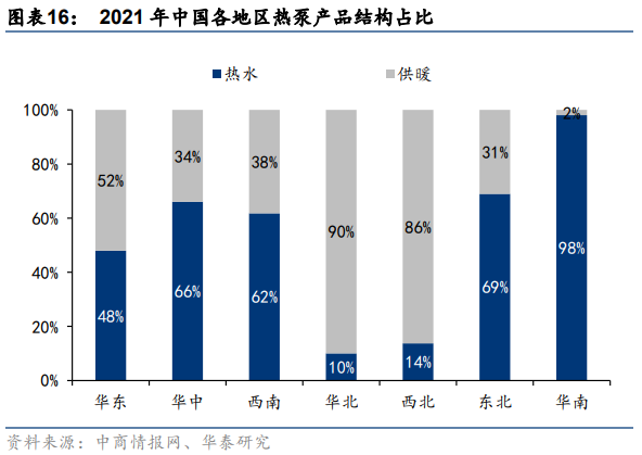 85%以上;南方地区(华南、西南)以热水为主。华东地区热水和供暖结构占比相当,占比分别为 48%、52%。