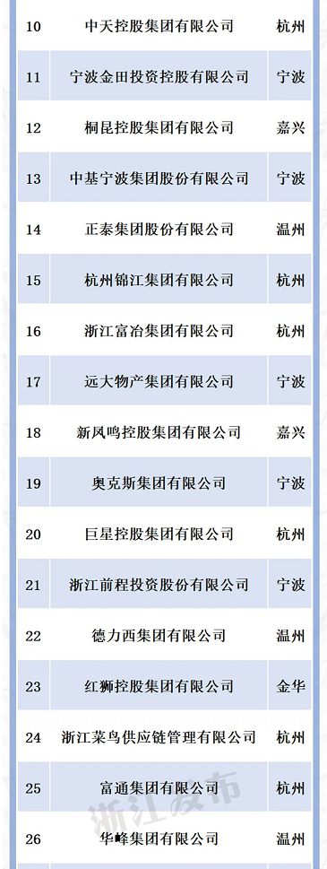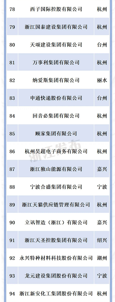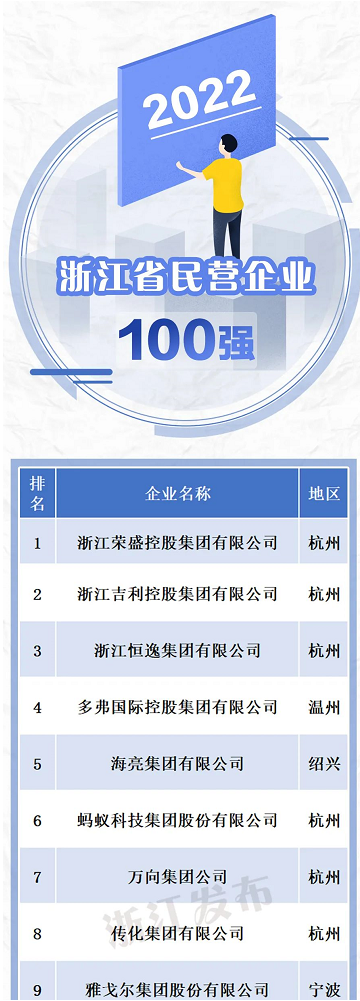 9月13日,浙江省市场监管局、省工商业联合会联合公布“2022年浙江省民营企业100强”榜单,对浙江省排名前100的民营企业进行了公布,下面是排行榜: