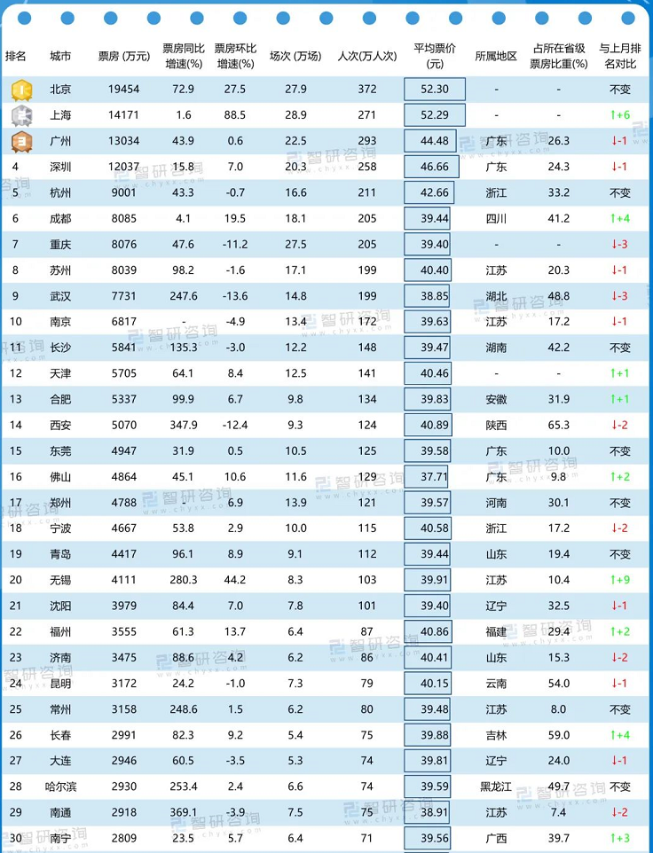 前十名分别为北京、上海、广州、深圳、杭州、成都、重庆、苏州、武汉、南京,票房分别为19454万元、14171万元、13034万元、12037万元、9001万元、8085万元、8076万元、8039万元、7731万元、6817万元。