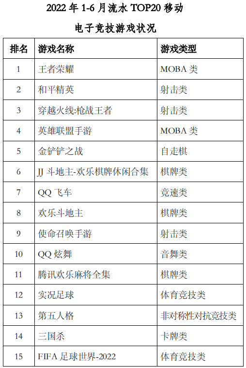 据中国游戏产业研究院,2022上半年,移动游戏流水排行榜前十名分别为王者荣耀、和平精英、穿越火线:枪战王者、英雄联盟手游、金铲铲之战、J斗地主-欢乐棋牌休闲合集、QQ飞车、欢乐斗地主、使命召唤手游、QQ炫舞。