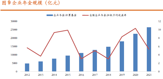 企业年金规模平稳增长,但覆盖率仍然较低。截至 2021 年末,企业年金积累基金规模达 2.64 万亿,较 2012 年增长 4.5 倍,收益率基本保持在