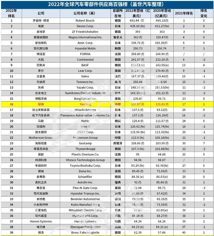 注:按照惯例,《美国汽车新闻》根据供应商提供的上一年在汽车行业配套市场的营业收入(销售额)进行排名。因此,2022年全球零部件配套供应商百强榜的评定标准是供应商2021年度的业绩。在参与百强榜评选时,供应商需要提供公司名称、总部所在地、联系方式以及相关数据。因此,部分规模较大的零部件供应商没有上榜,或许是因为没有提交相关数据。
