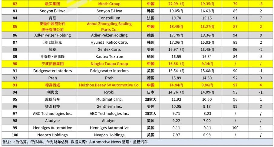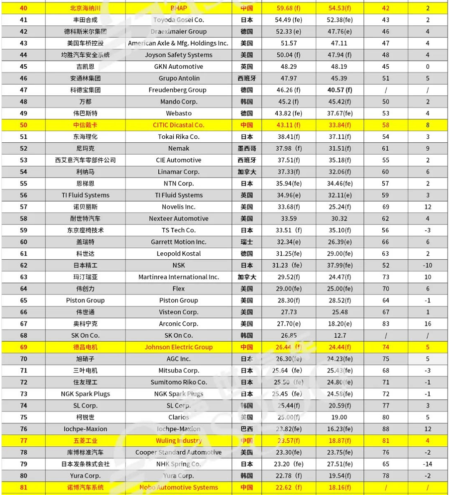 On(68名)、诺博汽车系统(81名)、宁波拓普集团(90名)、ABC Technologies(97名)、Aludyne(98名)、Neapco