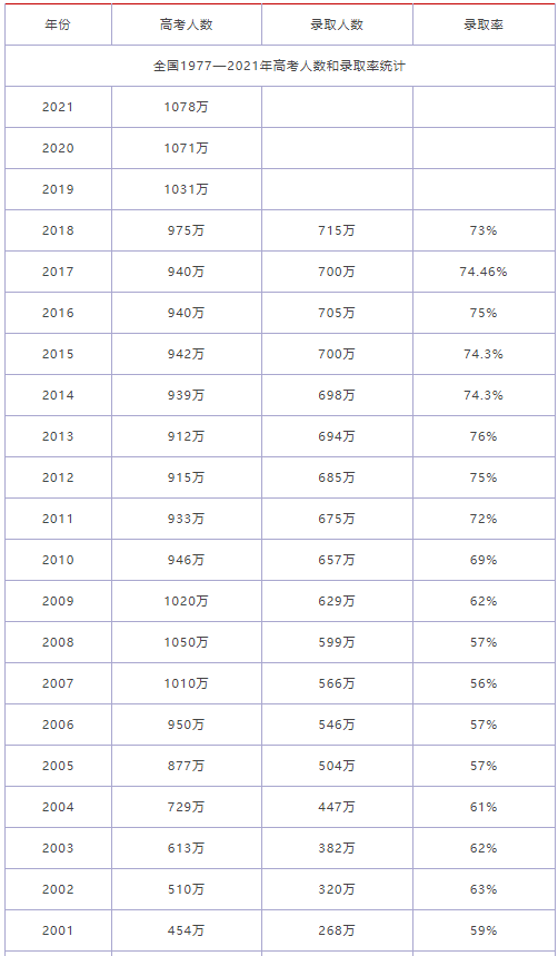 2021年,全国的高考人数达1078万,和2020年相比,高考人数增加了7万人,增长率为0.65%。