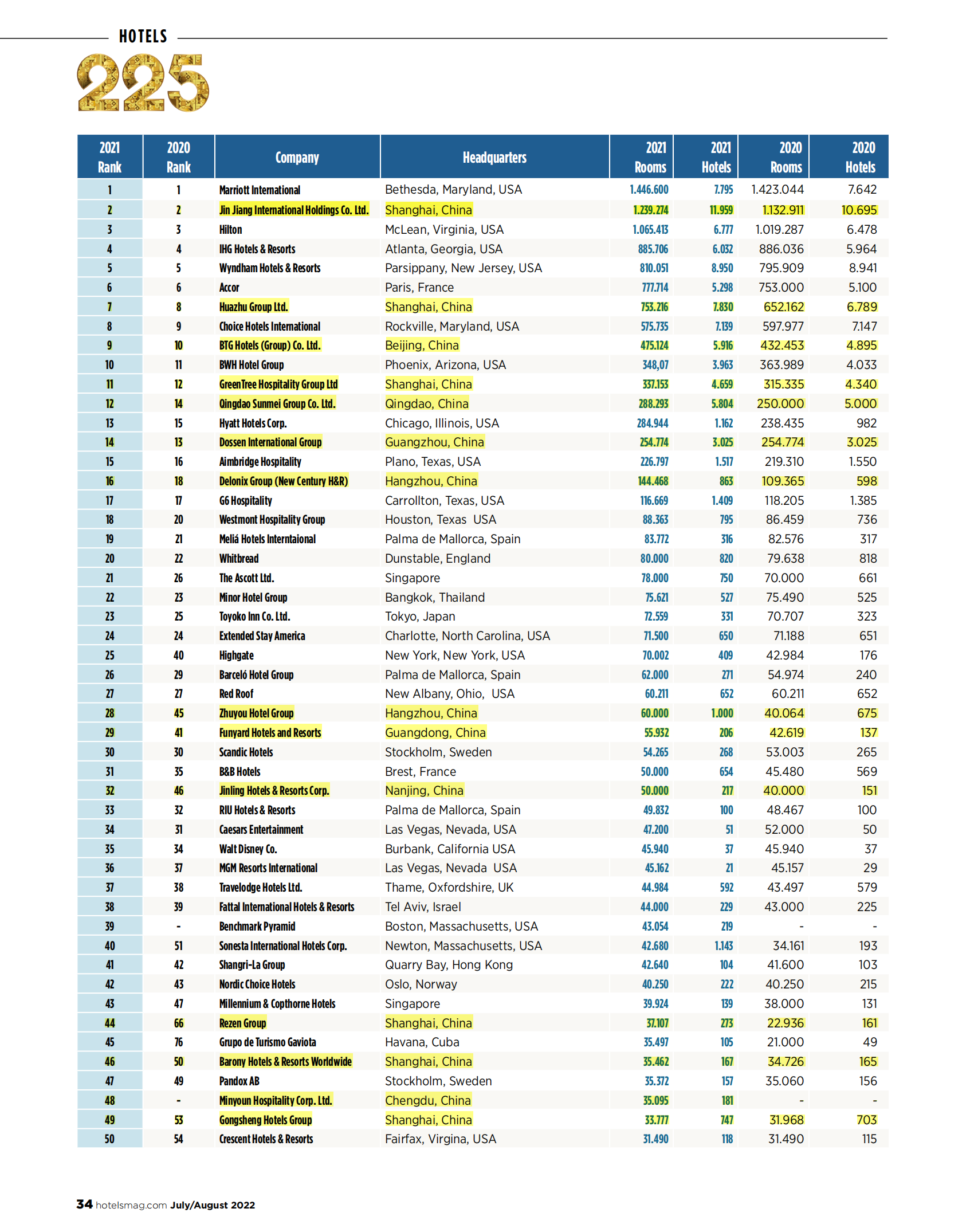 225)排名。中国共有34个酒店集团入围榜单,22个酒店集团相较2020年排名有所上升。