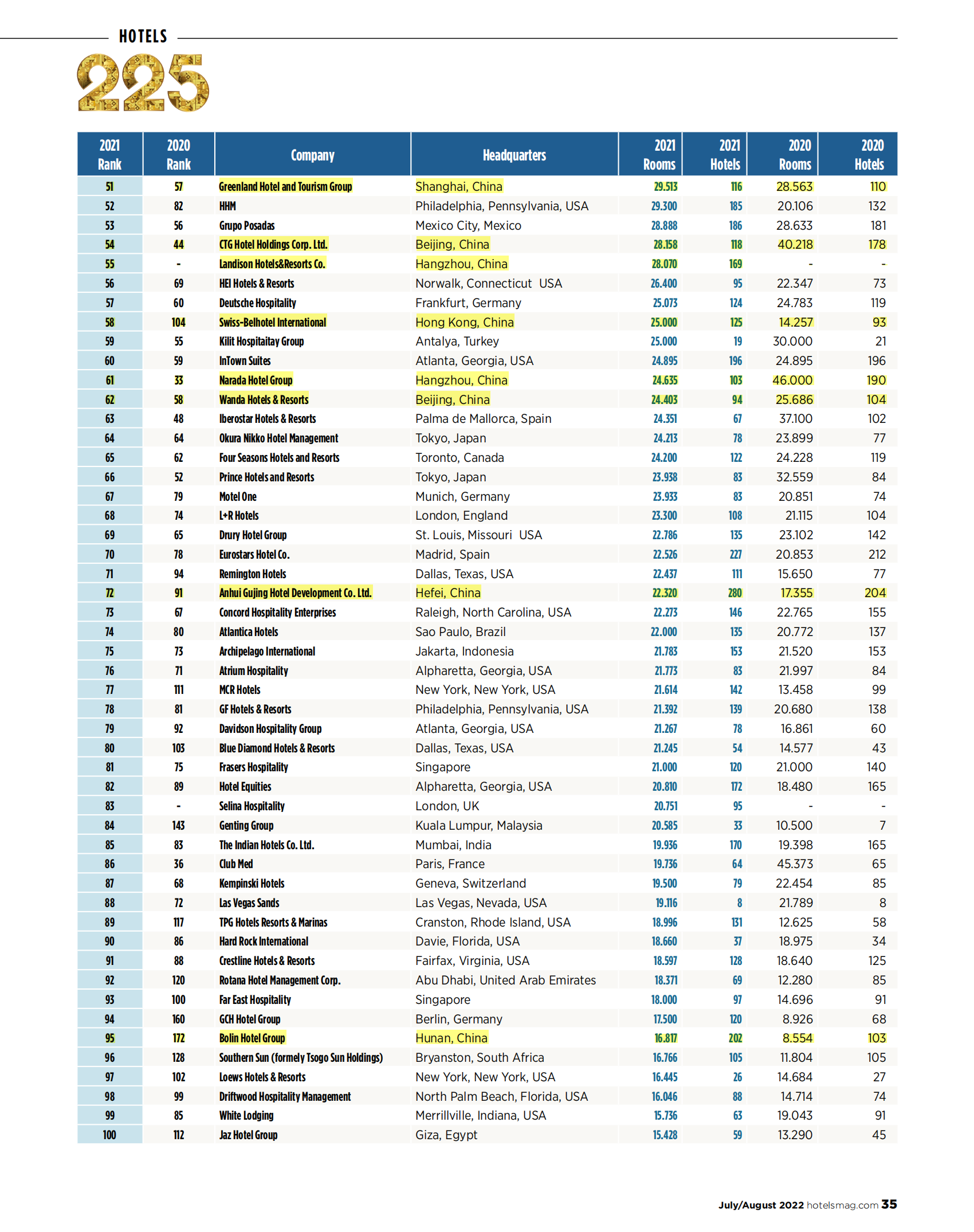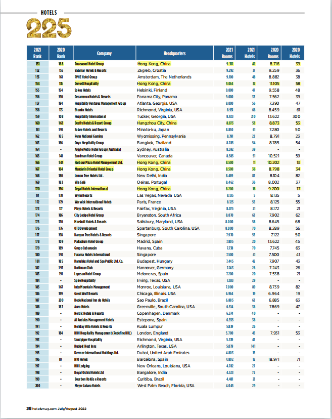 根据美国酒店业国际权威杂志《HOTELS》公布2021年度“全球酒店集团225强” (HOTELS
