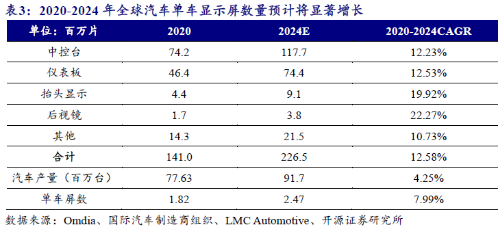 根据 Omdia、国际汽车制造商组织和 LMC 的数据,2020 年全球汽车单车屏幕数量为 1.82 块,预计到 2024 年单车屏幕数量将提升至