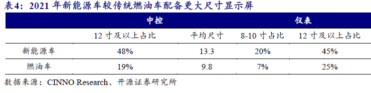 2.47 块。中控屏和液晶仪表是目前汽车显示主要的应用场景。根据 CINNO 研究数据,2021 年新能源车中控屏平均尺寸为 13.3 寸,而传统燃油车为