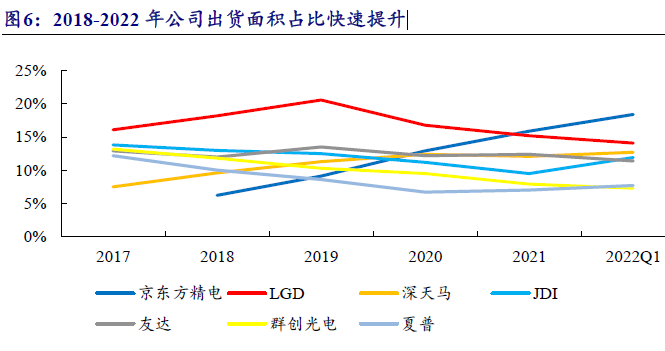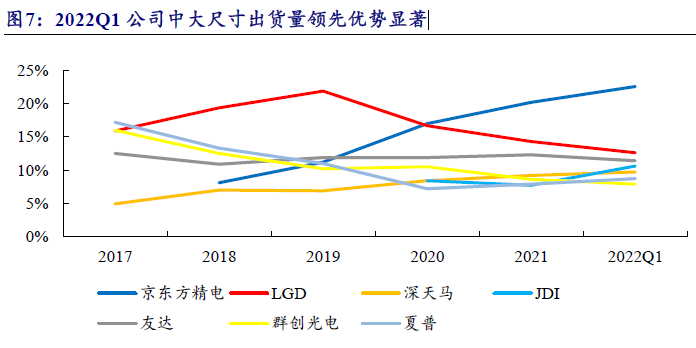 18.4%,中大尺寸出货量占比为 22.6%,分别领先第二名的 LGD 4.3 个百分点和6 个百分点。并且在