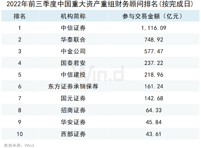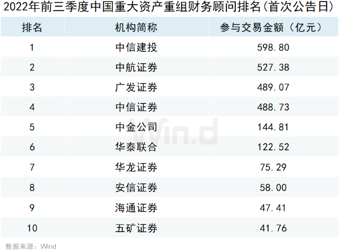 从机构担任财务顾问或者独立财务顾问参与的重大资产重组事件规模来看,按照事件首次公告日在2022年前三季度的口径统计,国内最大并购机构是中信建投,排行第二、第三的是中航证券和广发证券。按照重大资产重组事件完成日口径统计,国内最大并购机构是中信证券,排行第二、第三的是华泰联合和中金公司排行。