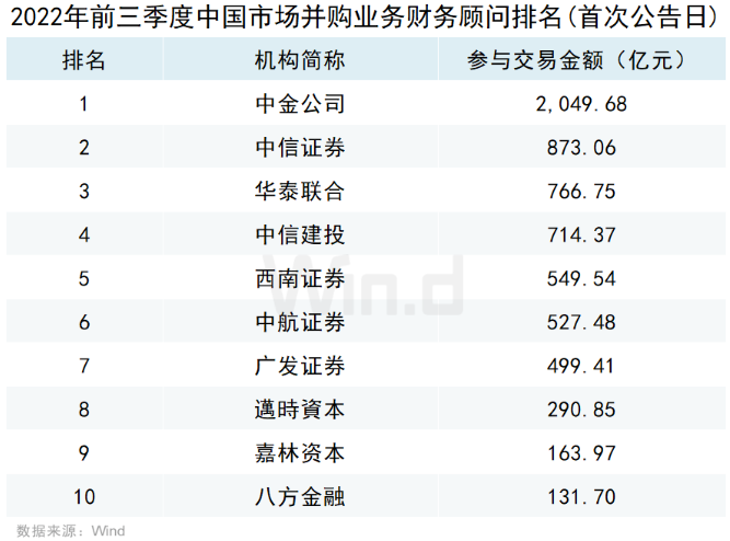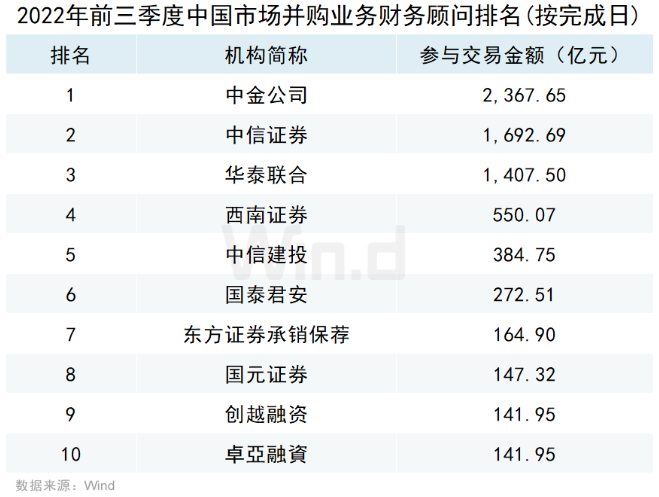 从机构担任财务顾问或者独立财务顾问参与并购事件的规模来看,按照事件首次公告日在2022年前三季度的口径统计,国内最大并购机构是中金公司,排行第二、第三的是中信证券、华泰联合。按照2022年上前三季度完成的并购事件维度统计,国内最大并购机构为中金公司,排行第二、第三的是中信证券和华泰联合。