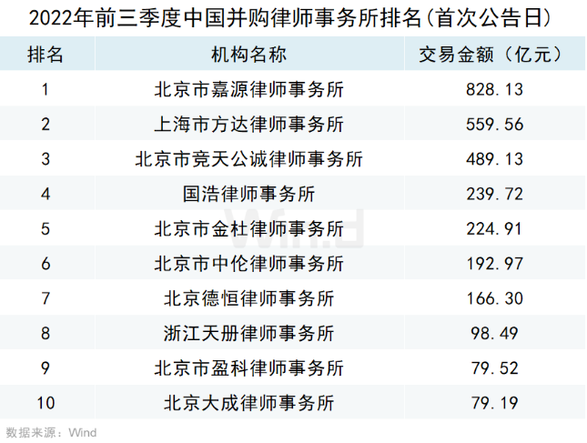 从律师事务所参与并购的规模来看,按照事件首次公告日在2022年前三季度的口径统计,国内最大并购机构是为北京市嘉源律师事务所,排行第二、第三的是上海市方达律师事务所和北京市竞天公诚律师事务。按照并购事件完成日口径统计,国内最大并购机构是上海市锦天城律师事务所,排行第二、第三的机构是北京市中伦律师事务所和上海市方达律师事务所。