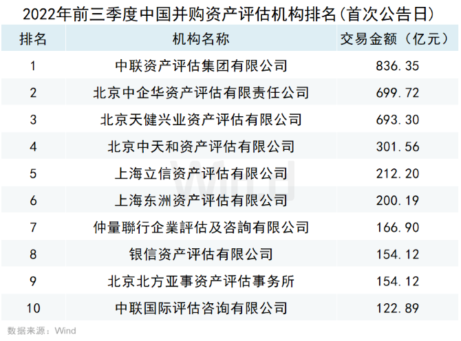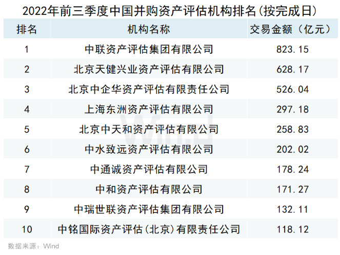 资产评估机构参与并购事件的规模来看,按照事件首次公告日在2022年前三季度的口径统计,国内最大并购机构为中联资产评估集团有限公司,排行第二、第三的是北京中企华资产评估有限责任公司、北京天健兴业资产评估有限公司。按照并购事件完成日口径统计,国内最大并购机构为中联资产评估集团有限公司,排行第二、第三的是北京天健兴业资产评估有限公司、北京中企华资产评估有限责任公司。